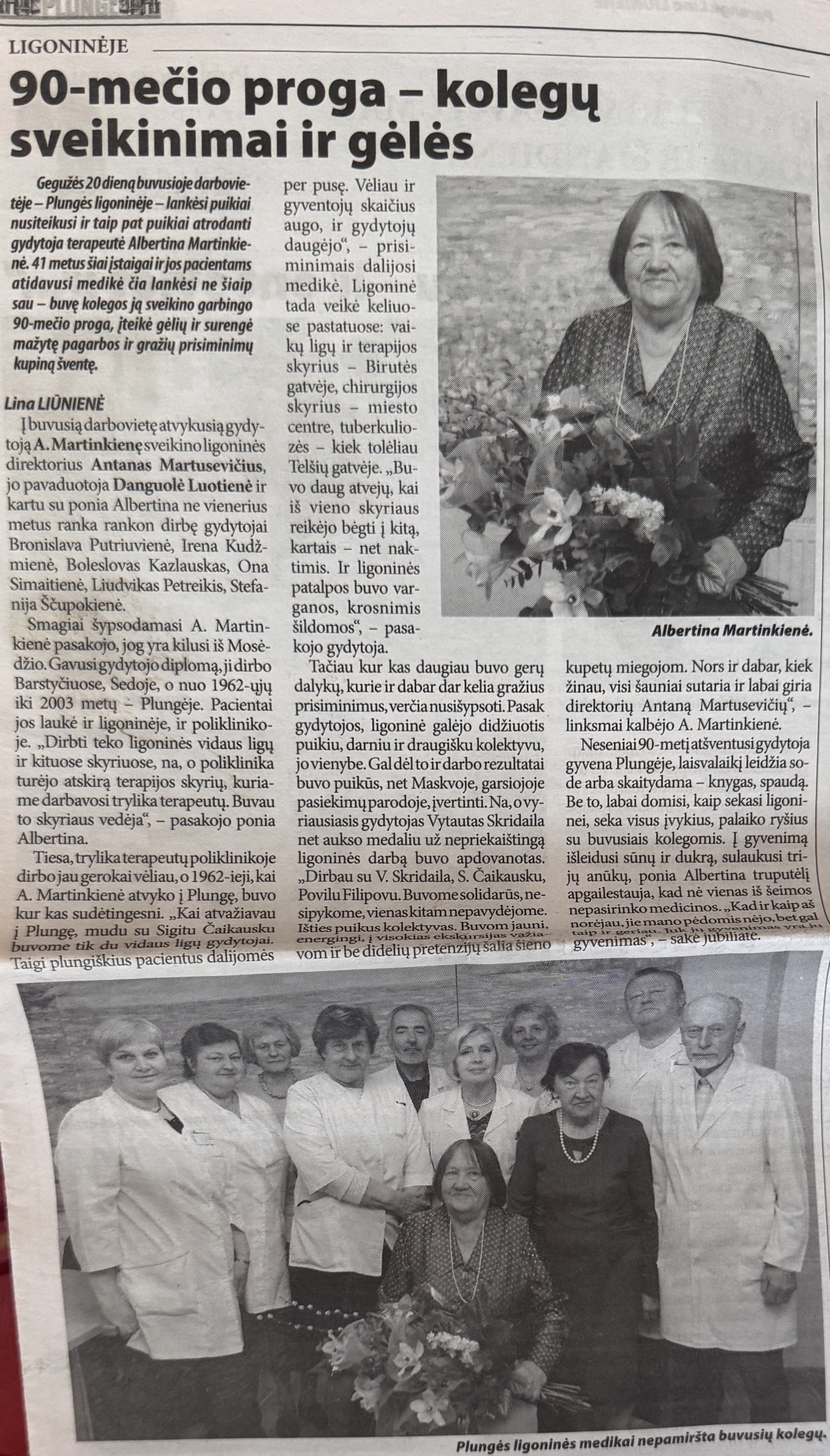 Albertina Martinkienė – ne tik ilgametė Plungės ligoninės gydytoja, bet ir žmogus, kurio gyvenimas tarsi įkūnija atsidavimo, profesinės ištikimybės ir tikro žmogiškumo prasmę. Net 41 metus ji skyrė Plungės žmonėms – dirbo ligoninės terapijos, vidaus ligų, tuberkuliozės skyriuose, poliklinikoje, buvo skyriaus vedėja ir ne kartą ėjo atsakingas pareigas.