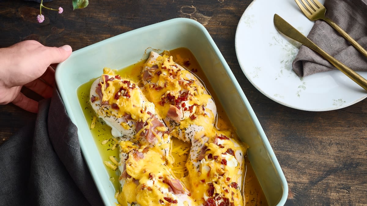 Patepkite kepimo indą alyvuogių aliejumi. Sudėkite vištienos krūtinėles ir apibarstykite jas druska bei pipirais. Ant kiekvienos filė uždėkite sluoksnį kreminio minkšto sūrio, užklokite suplėšytu vytintu kumpiu ir kubeliais supjaustyta chorizo dešra. Užbarstykite tarkuoto čederio sūrio. Į kepimo indą supilkite vištienos sultinį. Dėkite indą į orkaitę, įkaitintą iki 180 °C, ir kepkite 20–30 minučių, kol vištiena iškeps, o sūris išsilydys.