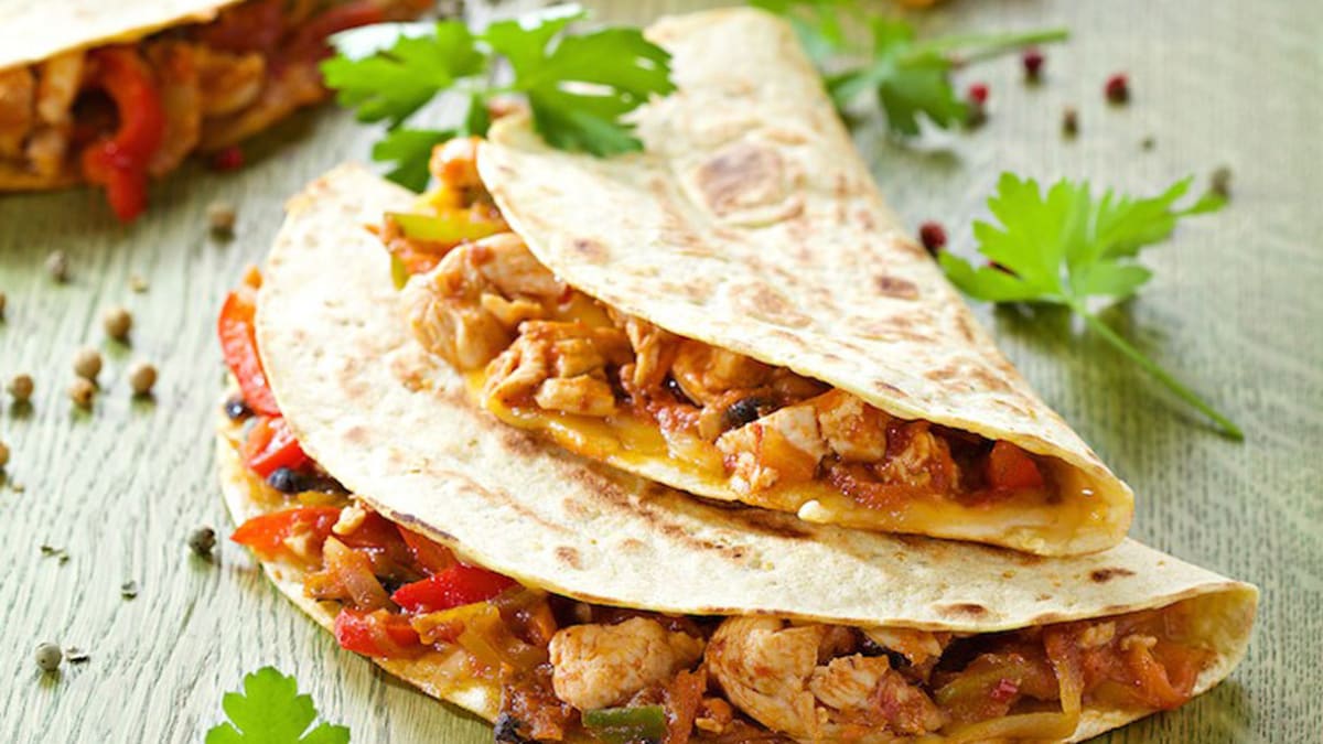 Įkaitinkite keptuvę ir įpilkite aliejaus. Trumpai apkepkite susmulkintą svogūną kartu su tarkuota morka. Tuomet sudėkite nedideliais gabalėliais pjaustytą vištieną ir šiaudeliais supjaustytas saldžiąsias paprikas, kepkite apie 15 minučių. Galiausiai suberkite pjaustytus pievagrybius, įpilkite aštraus pomidorų padažo ir kepkite, kol grybai suminkštės. Sudrėkinkite tortilijas tarp šlapių delnų, kad jos nelūžtų. Ant viso blyno paskleiskite maždaug 1 cm storio tarkuoto sūrio sluoksnį, o pusę tortilijos ploto padenkite paruoštu įdaru ir atsargiai sulenkite. Sudėkite kesadilijas į įkaitintas groteles arba rantytą keptuvę, pateptą aliejumi, ir apskrudinkite iš abiejų pusių, kol gražiai parus.