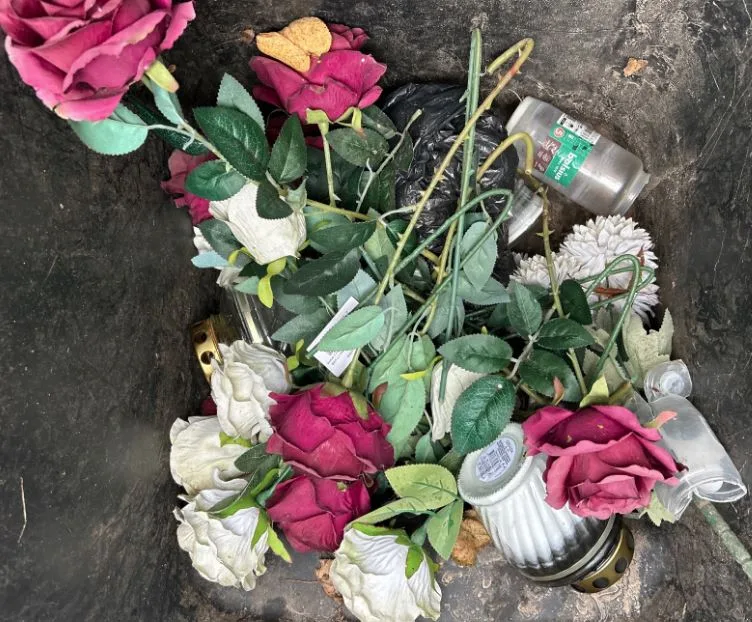 Jeigu iš žvakidės neįmanoma pašalinti vaško likučių, ji turi keliauti į mišriųjų komunalinių atliekų konteinerį. Suteptas ir nebetinkamas toliau naudoti plastikines gėles ir dekoracijas reikia išmesti į mišriųjų komunalinių atliekų konteinerį. Plastiko ir metalo pakuočių atliekų surinkimo konteineris yra skirtas tik pakuotėms ir jų dalims, dėl to plastikiniai gaminiai į jį negali būti rūšiuojami.