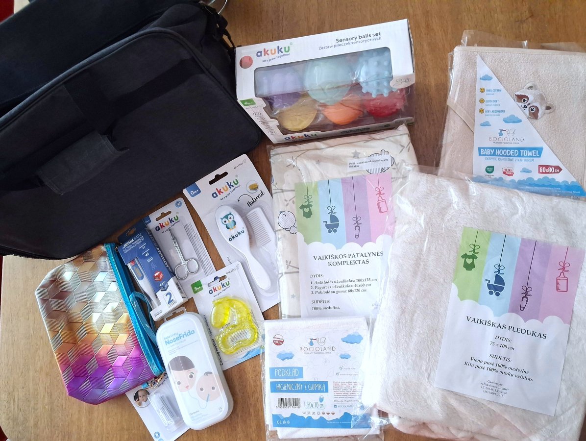 Dovanojamoje kūdikio kraitelio rankinėje tėvai ras rankšluostį su gobtuvu, pleduką, kramtuką-žaisliuką, patalynės komplektą, priežiūros rinkinį (termometrą, žirklutes, šukas, plaukų šepetį), nosies aspiratorių, neperšlampantį paklotą, silikoninį dantų šepetuką, sensorinius kamuoliukus.