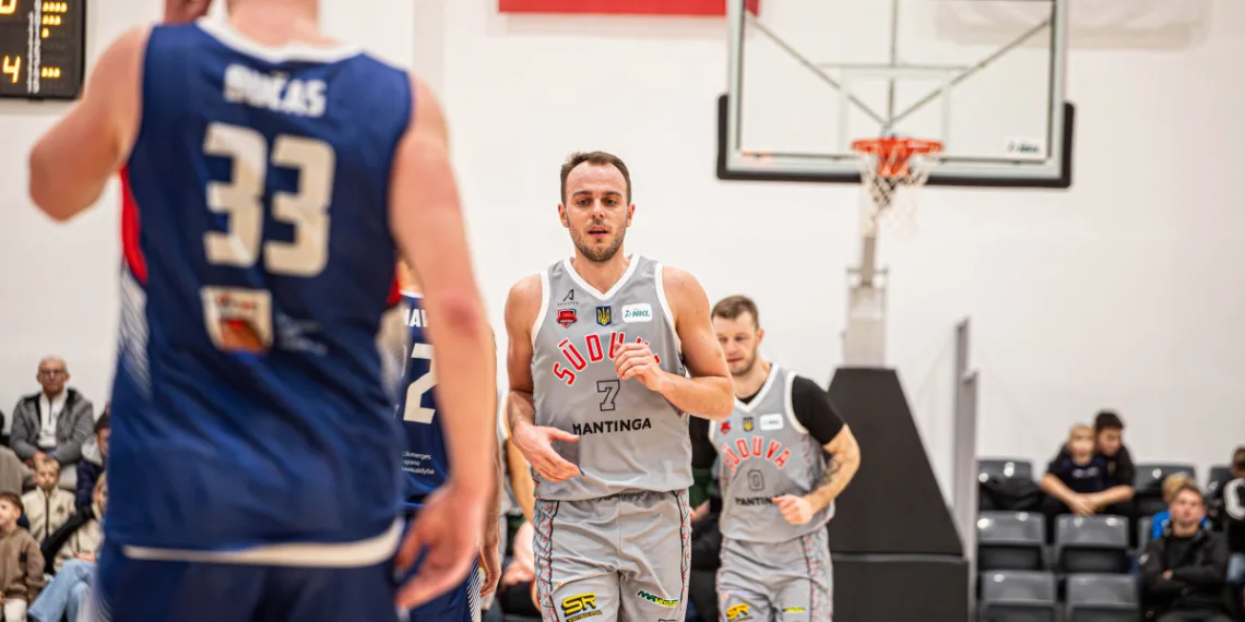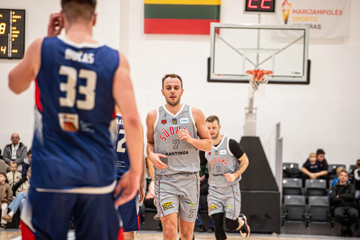 „Sūduva-Mantinga“ krepšininkai per 3,5 minutės atkarpą iki didžiosios pertraukos smogė 15:3 spurtu ir į rūbinę išėjo pirmaudami dviženkle persvara – 48:38.