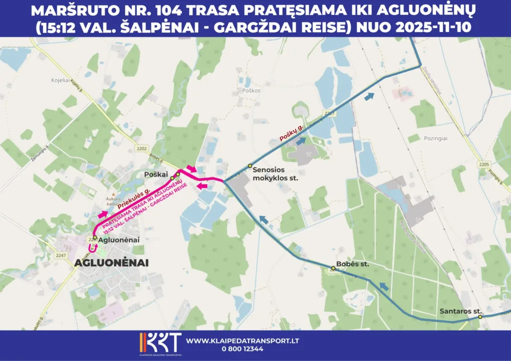 Darbo dienų 104-ojo maršruto 15:12 reise Šalpėnai–Gargždai pridedamas papildomas užsukimas į Agluonėnus. Jis pridėtas sutrumpinus reiso viduryje esančią pertrauką Veirviržėnuose, tad bendra reiso trukmė nesikeis. Paankstės tik išvykimas iš Veiviržėnų (nuo 16:00 iki 15:51 val.). Šis sprendimas pasiekti Agluonėnus padės ne tik gyventojams, kuriems šis maršrutas tinkamas, bet ir Veiviržėnų Jurgio Šaulio gimnazijos mokiniai galės patogiau grįžti namo po pamokų ir neformaliojo ugdymo veiklų. Nuo pirmadienio mokiniai 15:52 val. iš Veiviržėnų jau galės važiuoti į Agluonėnus.
