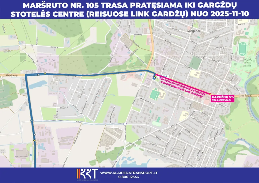 Priekulės krypties 105-ajame maršrute Gargždai–Šiūpariai–Svencelė grįžtant į Gargždus visuose reisuose pridėta papildoma stotelė – autobusai nuo šiol stos ir Gargždų miesto centre. Tai leis vyresnio amžiaus žmonėms lengviau pasiekti gydymo įstaigas bei kitas čia veikiančias paslaugas. Centre autobusas stos tik atveždamas keleivius. Išvykstant iš Gargždų, autobusas keleivių lauks kaip įprasta – autobusų stotyje.