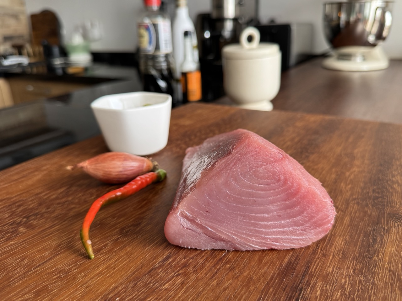 - Tuną pjaustau 0,5–1 cm dydžio kubeliais ir stengiuosi jo nesusmulkinti. Dedu į dubenį, suberiu labai smulkiai pjaustytą šalotą. Įpilu sojos padažo, alyvuogių aliejaus, įdedu lašelį „Hoisin“ ir šiek tiek vasabio, pagardinu juodaisiais pipirais.